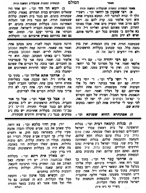 The students of Rabbi Shimon were discussing the curses in the Torah. They said that the first curses in the book of Leviticus were the aspect of the first Holy Temple, and the curses in Deuteronomy are the aspect of the second Holy Temple. The first set of curses included promises for a better future but no promises in the second set of curses. They were sad because their teacher, Rabbi Shimon, was far from them and he could have given them the answer to why it is so.