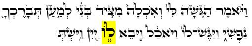 “וַיֹּאמֶר הַגִּשָׁה לִּי וְאֹכְלָה מִצֵּיד בְּנִי לְמַעַן תְּבָרֶכְךָ נַפְשִׁי וַיַּגֶּשׁ לוֹ וַיֹּאכַל וַיָּבֵא לוֹ יַיִן וַיֵּשְׁתְּ”
