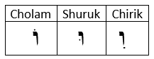 As we learned before, the Hebrew letters are vessels and the Nikkud (Vowels) is the light that animate the vessel and cause it to ‘radiate’ its light. The process of spreading the Light down the levels to the tenth Sefira of Malchut is represented by the letter ו Vav. It’s the aspect of the six sefirot of Zeir Anpin. The light of the upper three sefirot is represented by the Nikkud of Cholam (top dot), Shuruk (Middle dot), Chirik (bottom dot).