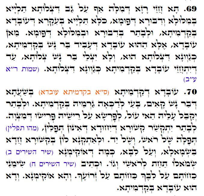 70. מַעֲשֶׂה רִאשׁוֹן (בָּרִאשׁוֹנָה מַעֲשֶׂה) בְּשָׁעָה שֶׁאָדָם קָם – צָרִיךְ לְטַהֵר עַצְמוֹ בַּתְּחִלָּה, וְאַחַר כָּךְ יְקַבֵּל עָלָיו עֹל זֶה, יִפְרֹשׂ עַל רֹאשׁוֹ פְּרִיסַת מִצְוָה. אַחַר כָּךְ יִקָּשֵׁר קֶשֶׁר הַיִּחוּד, שֶׁהֵם תְּפִלִּין, (מַהוּ תְפִלִּין?) תְּפִלָּה שֶׁל רֹאשׁ וְשֶׁל יָד, וּלְתַקְּנָם בְּקֶשֶׁר אֶחָד בִּשְׂמֹאל וְעַל הַלֵּב, כְּפִי שֶׁבֵּאַרְנוּ (שיר השירים ב) שְׂמֹאלוֹ תַּחַת לְרֹאשִׁי וְגוֹ’. וְכָתוּב (שם ח) שִׂימֵנִי כַחוֹתָם עַל לִבֶּךָ כַּחוֹתָם עַל זְרוֹעֶךָ. וַהֲרֵי בֵּאַרְנוּ. וְזֶהוּ הַמַּעֲשֶׂה שֶׁבַּתְּחִלָּה.