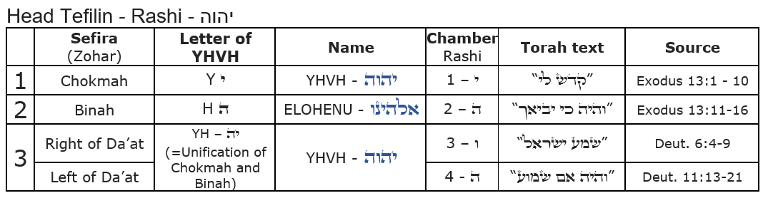 The Holy One Blessed be He in the aspect of Zeir Anpin, wears Tefillin. Four Torah parts that represent the light of Zeir Anpin above are placed on the head connecting to the brain. Four Torah parts placed as one on the arm, pointing to the heart that is an aspect of Malchut.
