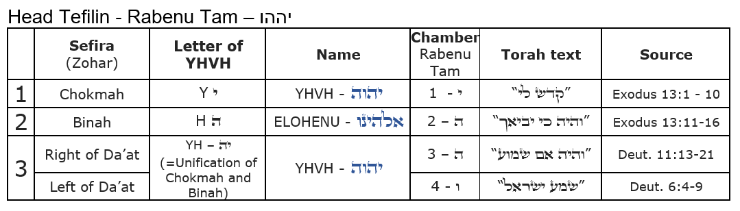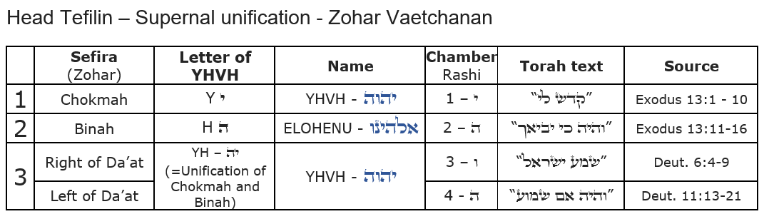 The unification of the Shema with the three names יְהוָה אֱלֹהֵינוּ, יְהוָה , YHVH, ELOHENU, YHVH is represented in the Tefillin as we see in the chart below: