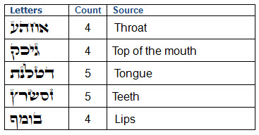 The words that come out from the mouth are constructed from the 22 letters and their roots are in 5 areas of the mouth.