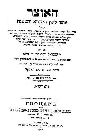 Ha-Oẓar, a Hebrew and Chaldaic dictionary giving Russian and German equivalents for the words of the Bible, Mishnah, and Midrashim, vol. i. (from א to ו), Warsaw, 1884